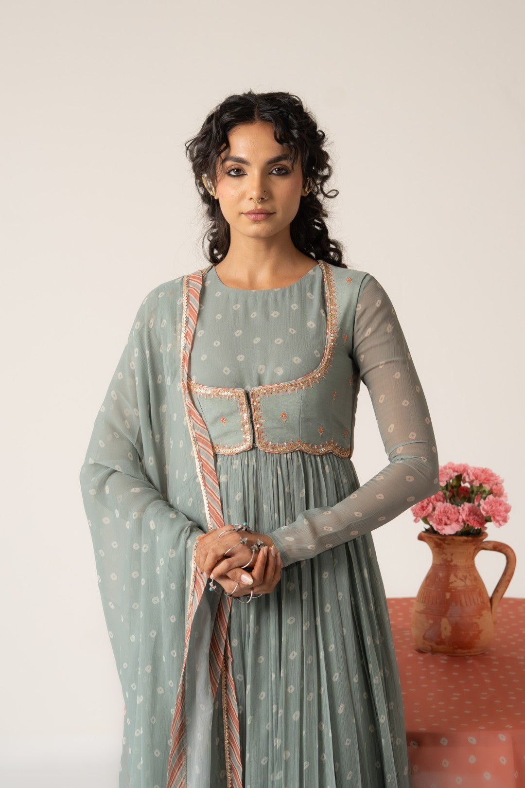 Make a statement in this pastel green chiffon Anarkali, featuring timeless bandhej motifs. The contrasting pastel green koti showcases scalloped embroidery on the hem and intricate back patchwork, mirrored in the lightweight chiffon dupatta that subtly sculpts the flowing silhouette. Styled with muslin straight pants, the ensemble exudes effortless sophistication and festive allure.