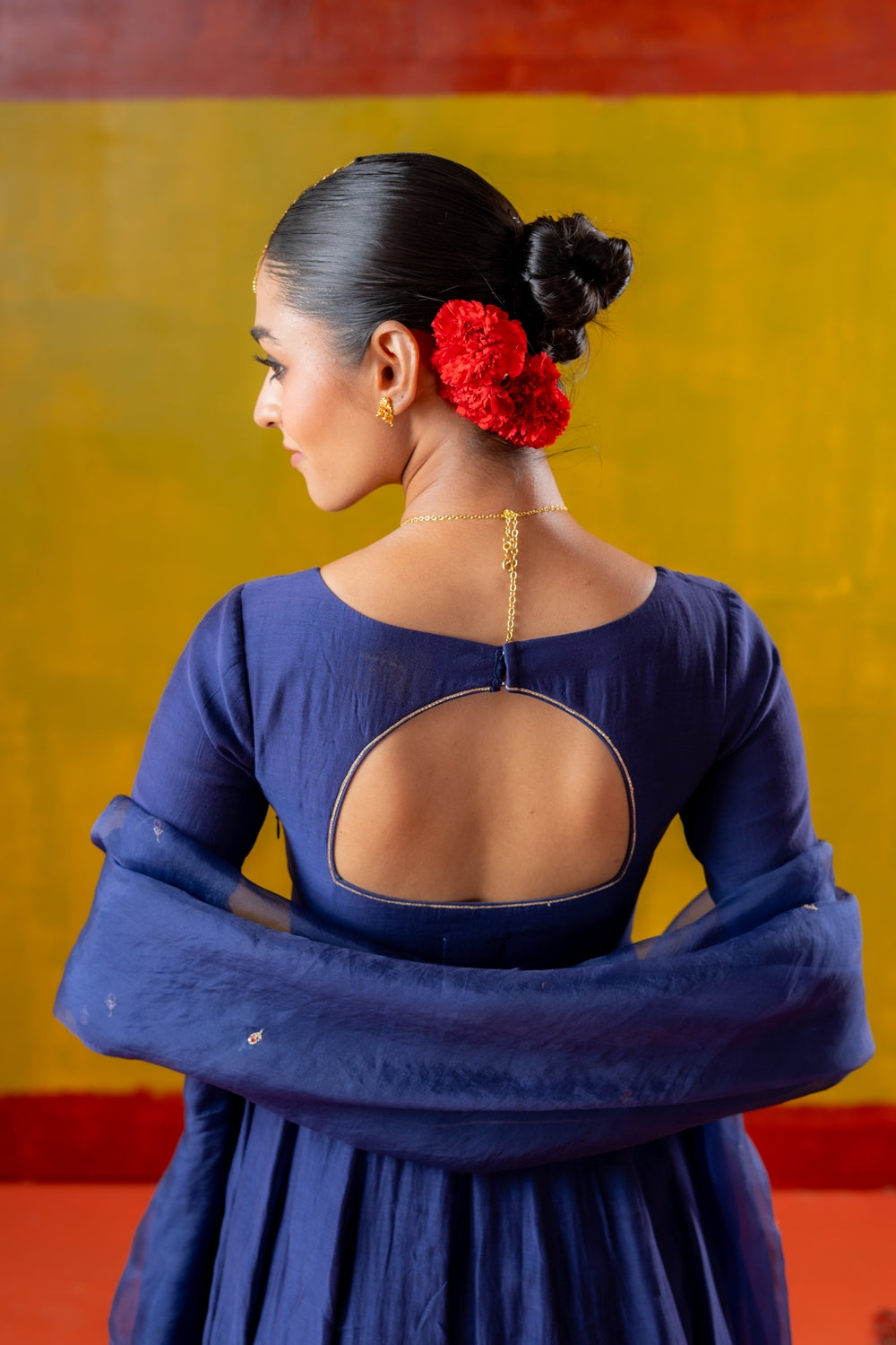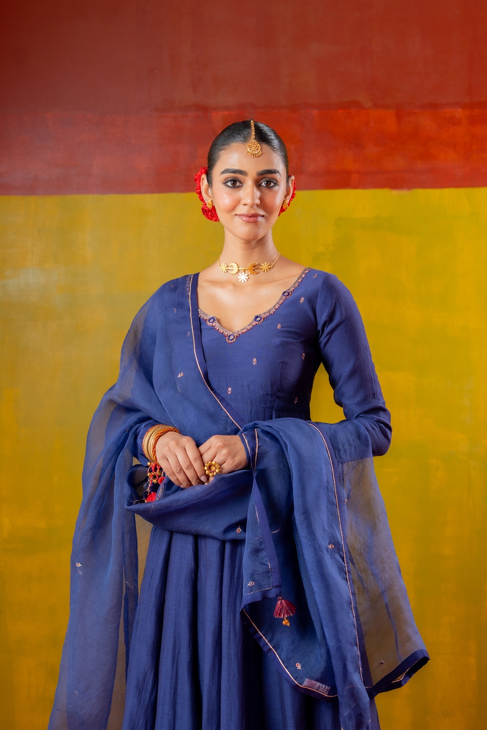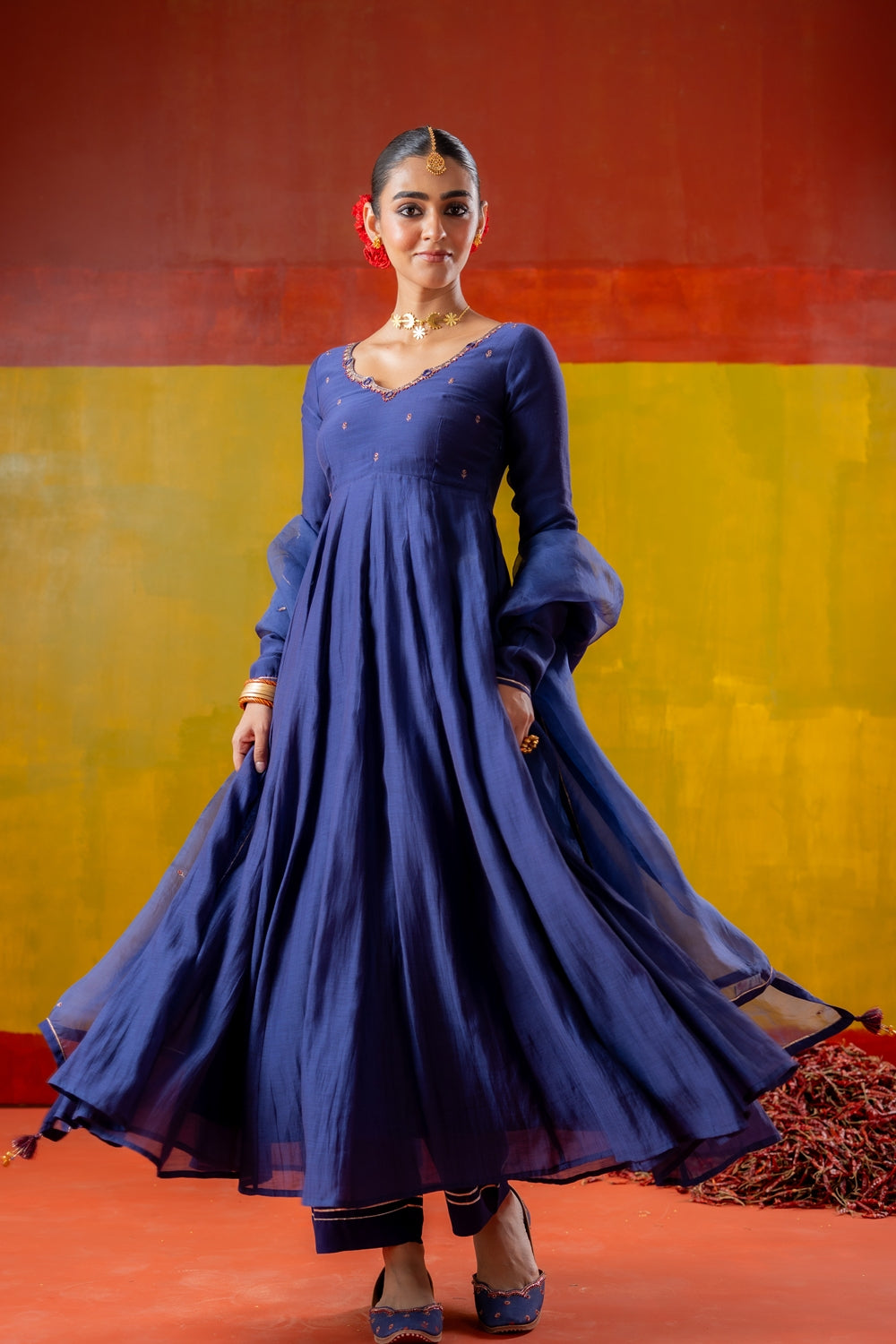 Crafted in deep navy chanderi, this Anarkali exudes quiet luxury with its gathered waist, full sleeves, and intricately scalloped neckline highlighted with fine embroidery. The chevron-printed chiffon dupatta lends visual texture and movement. Paired with a tailored muslin pant, this ensemble blends richness and ease—perfect for twilight festivities or intimate functions.