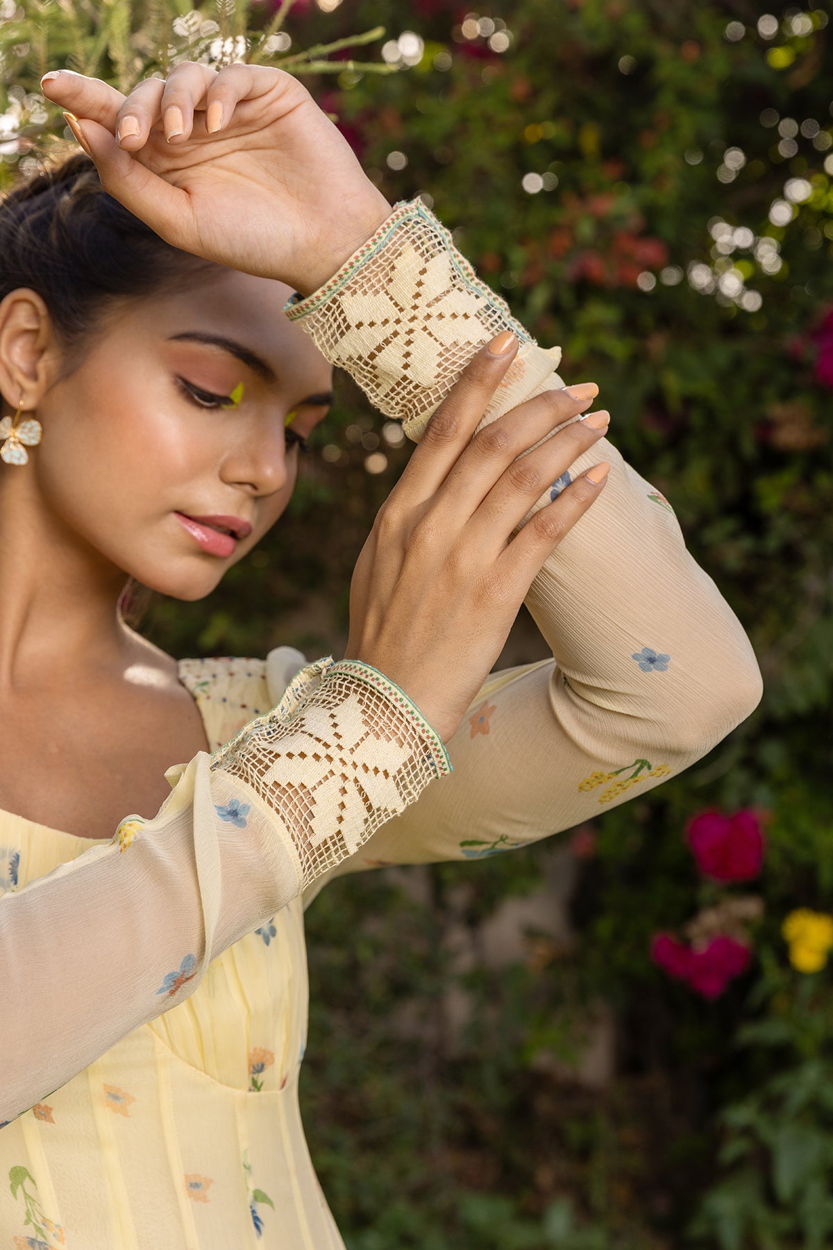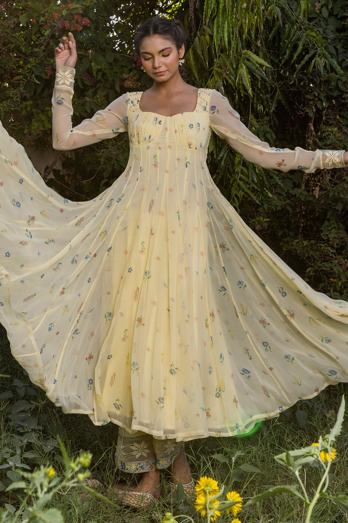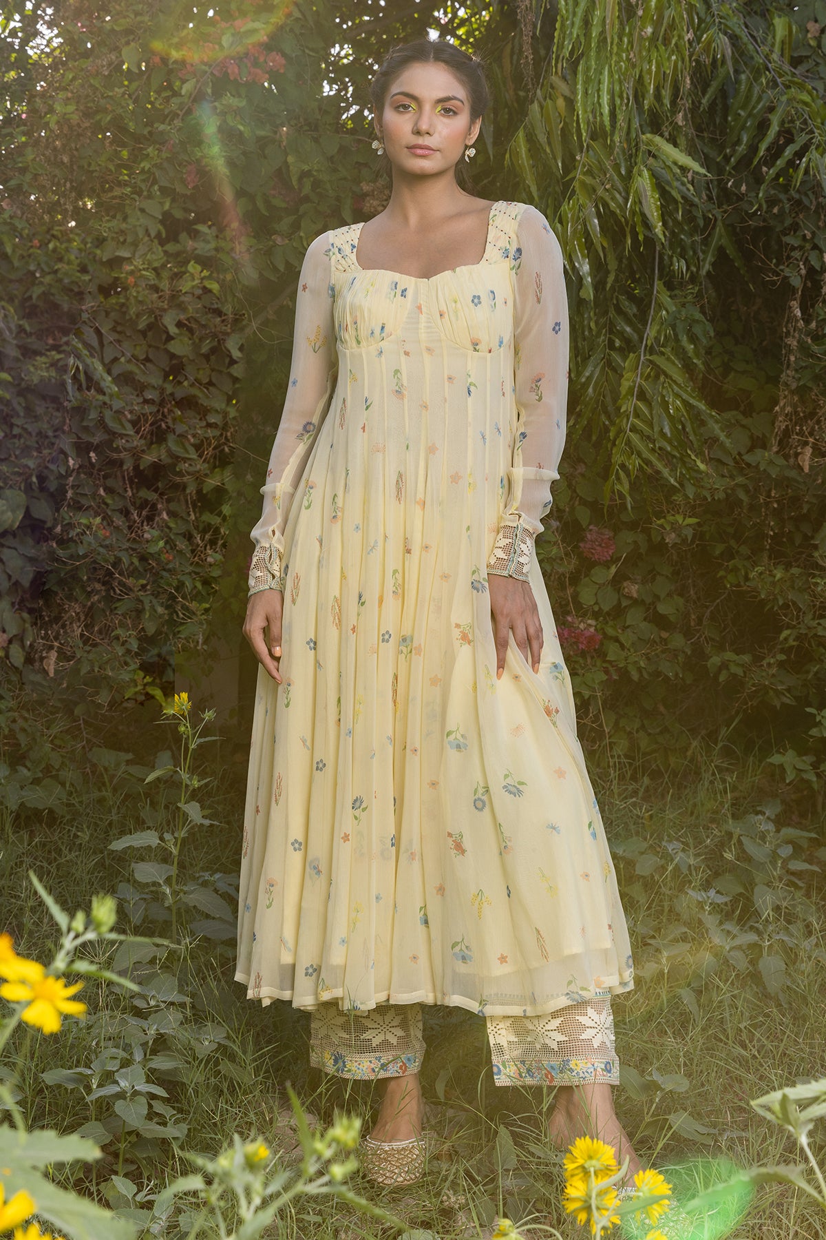 Juniper is a 28 Kalis Bustier style Anarkali with gather details at the cups and shell tucks details at the shoulder. The back is deep and secured with zipper closure whereas the star lace at the hem of full sleeves length give it a touch of grace and modernity at the same time. This anarkali is paired up with solid yellow modal pants with matte lace details at hem along with floral border and matching dupatta.