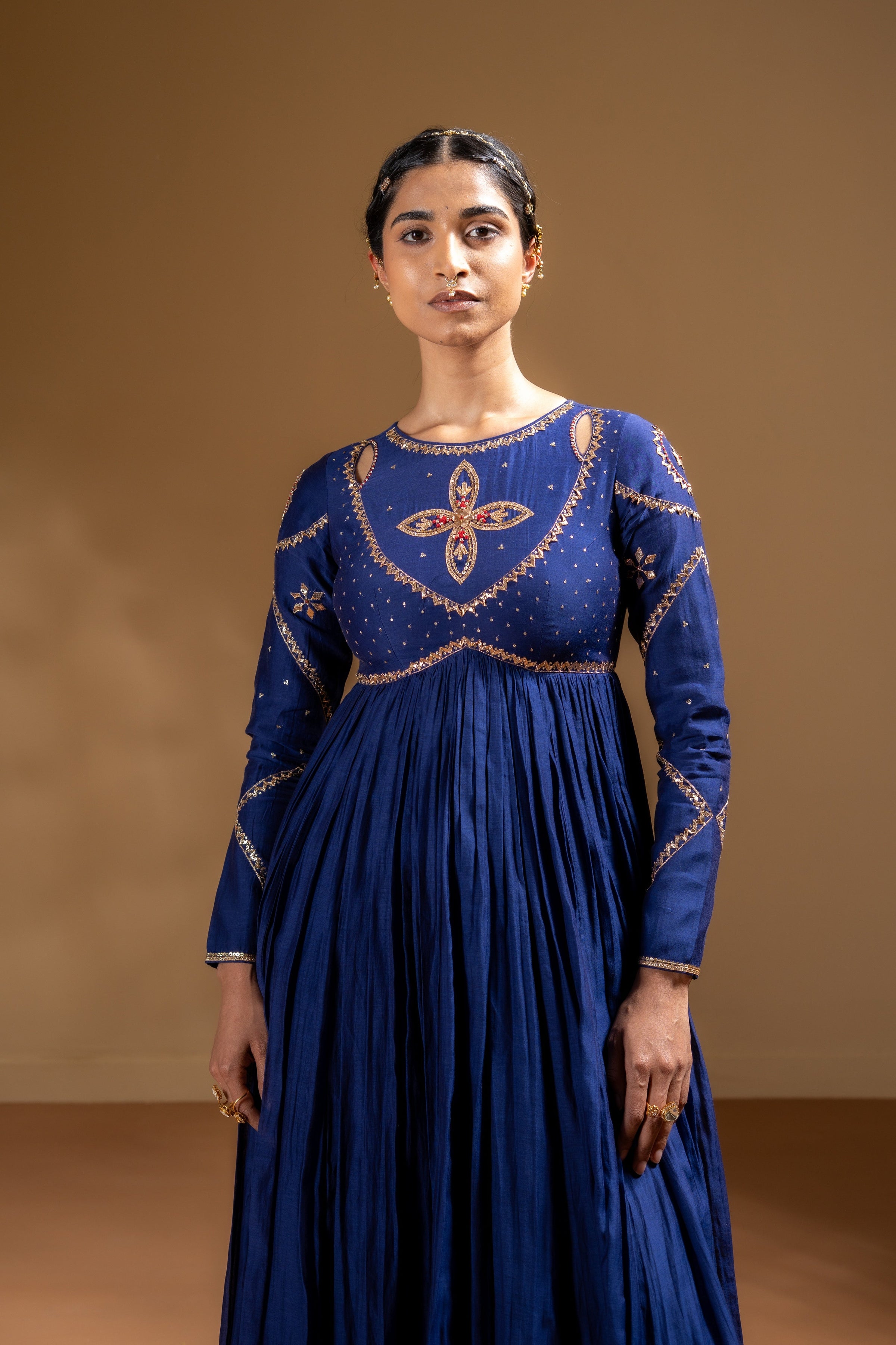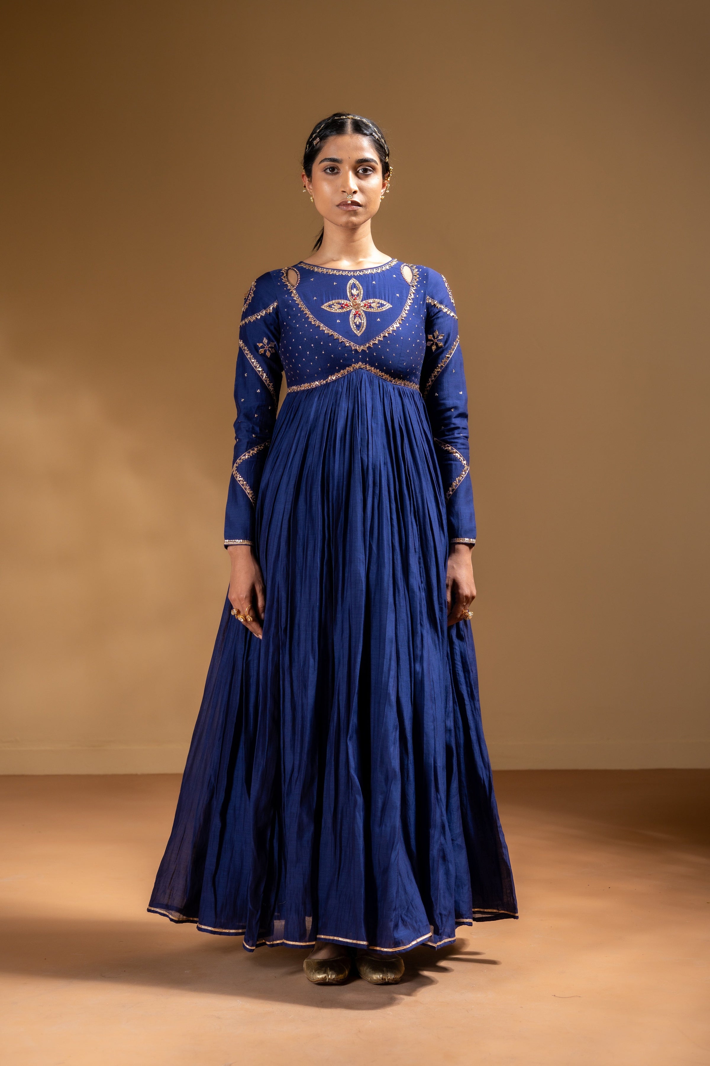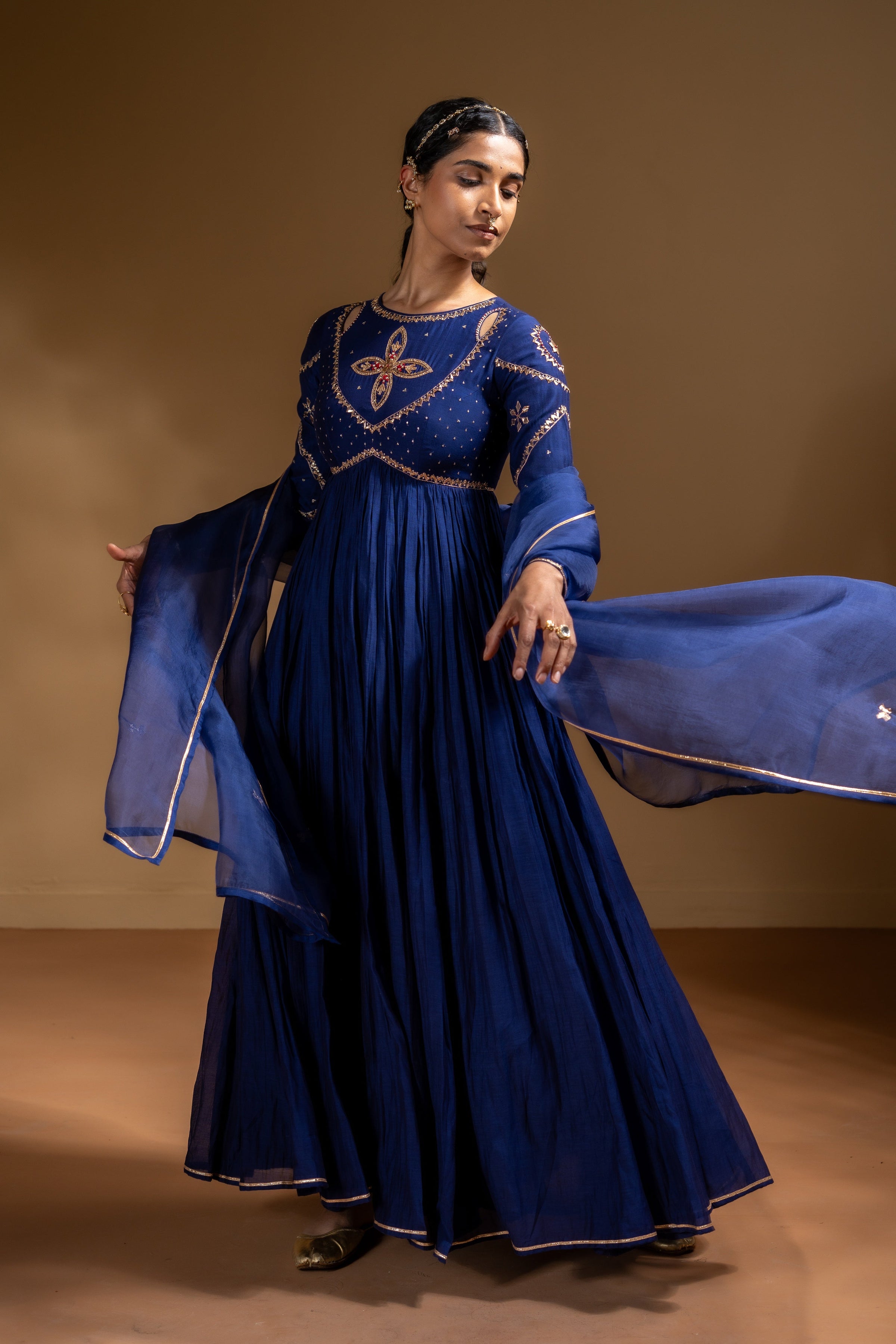 A three-piece Chanderi Anarkali set crafted in a deep blue hue, featuring elegant gota work throughout. The Anarkali is detailed with a delicate cut-out at the neckline, adding a contemporary touch to the classic silhouette. Paired with a lightweight organza dupatta with gota accents, ideal for festive and evening occasions.