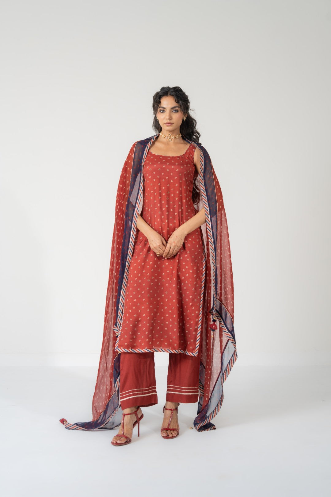 A classic kurta set, rendered in a rich solid red hue. Made in soft muslin, the kurta and pant offer fluidity and comfort. Complementing the set is a lightweight chiffon dupatta in our zig zag print. Ideal for intimate festive gatherings or pre-wedding functions, the outfit strikes a harmonious balance between minimalism and celebration.