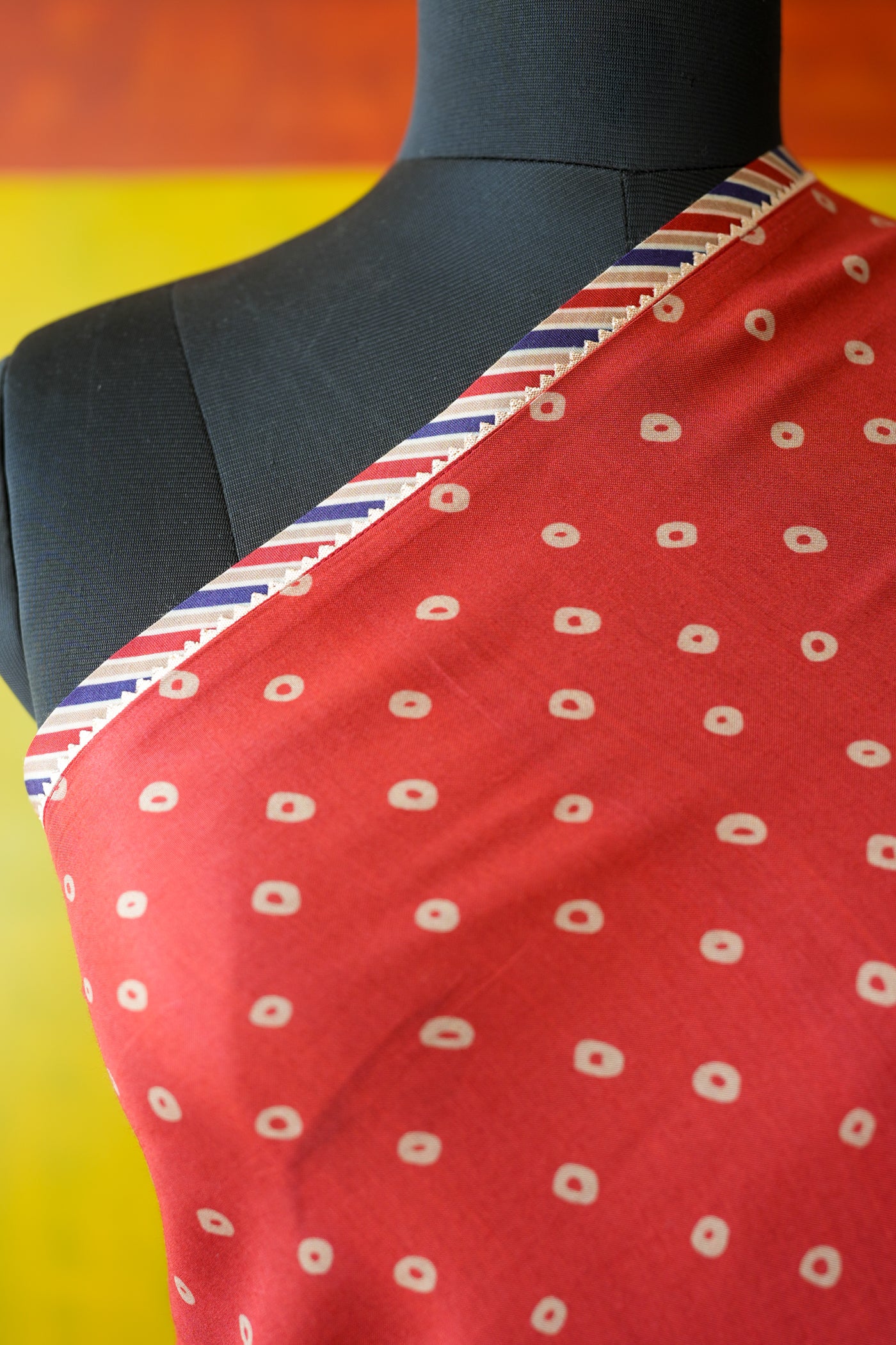 A classic six-yard chiffon saree in a beige base is adorned with our fish eye print and bordered with bandhani, rendered in hues of red and blue and decorated with tassels at the borders. It is paired with a matching deep red blouse piece that lends a soft, feminine charm. This look is rooted in cultural heritage yet remains wearable and festive, perfect for traditional occasions.