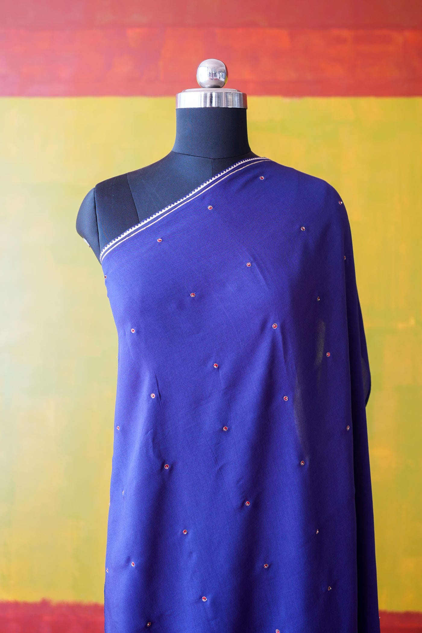 Crafted in lightweight organza, the saree features a stunning ombré transition from deep red to midnight blue with delicate hand-embroidery. The blouse piece comes in soft muslin. This ensemble fuses contemporary sophistication with festive grandeur.