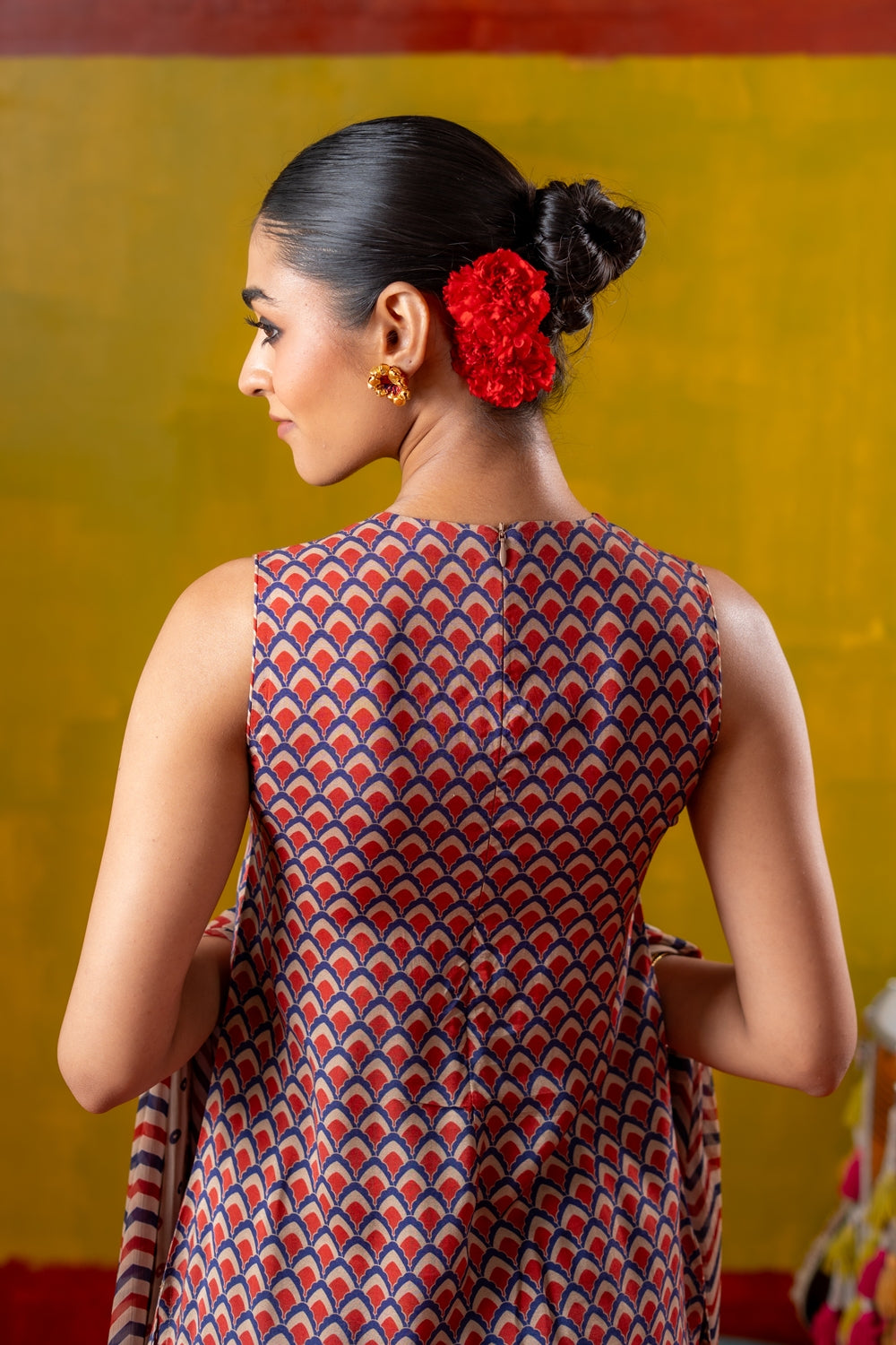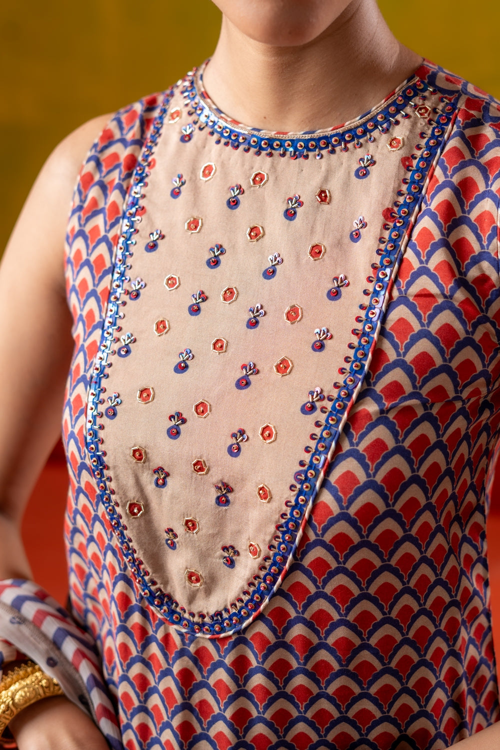 This ensemble features a sleeveless short kurti in muslin, adorned with intricate print and a statement embroidered yoke in contrasting print. The kurti is paired with a flowy farshi salwar in beige bandhani print, finished with a broad decorative border at the hemโblending comfort with regal elegance.