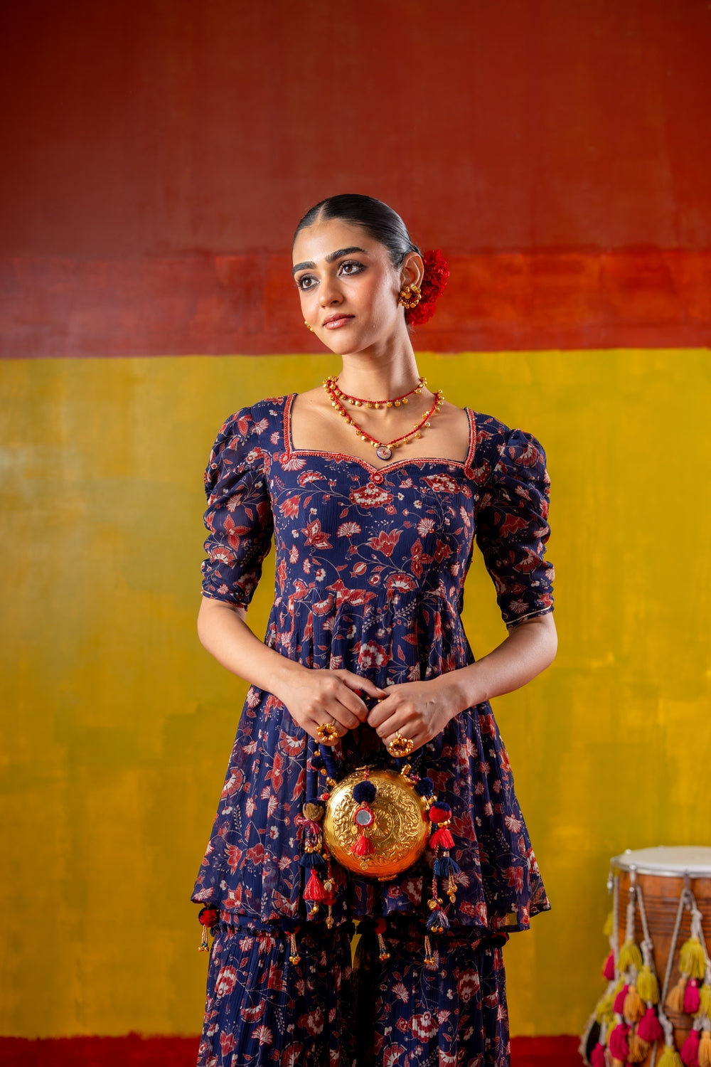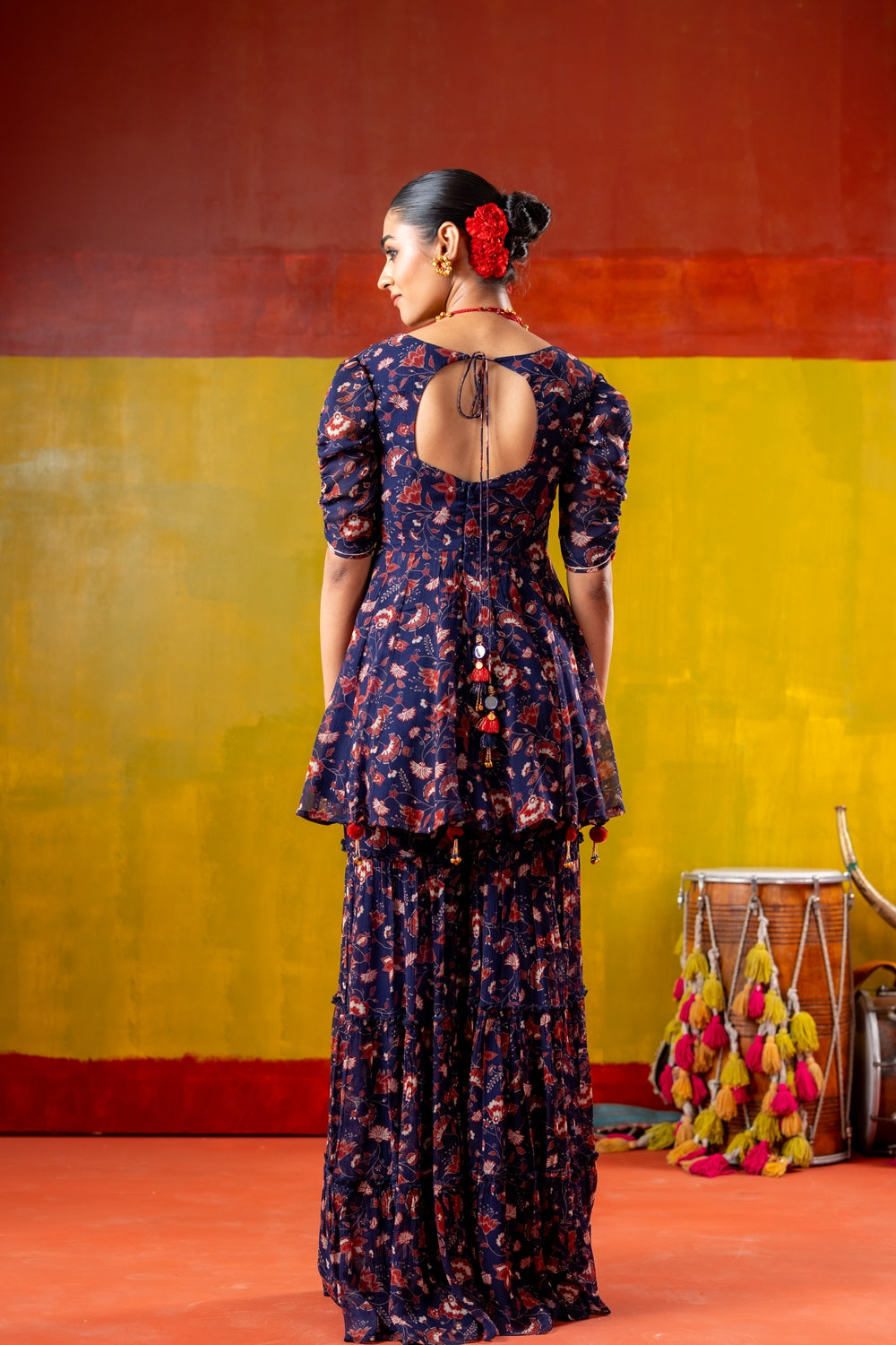 Crafted in lightweight chiffon, the set features a flared, short kurti paired with tiered gharara pants that echo the flowy silhouette. The neckline is a delicately curved sweetheart shape, accentuated with intricate embroidery that adds a touch of refinement. The puffy sleeves and abundant flare adds to the festive feel while our floral print elevates this ensemble with rich hues.