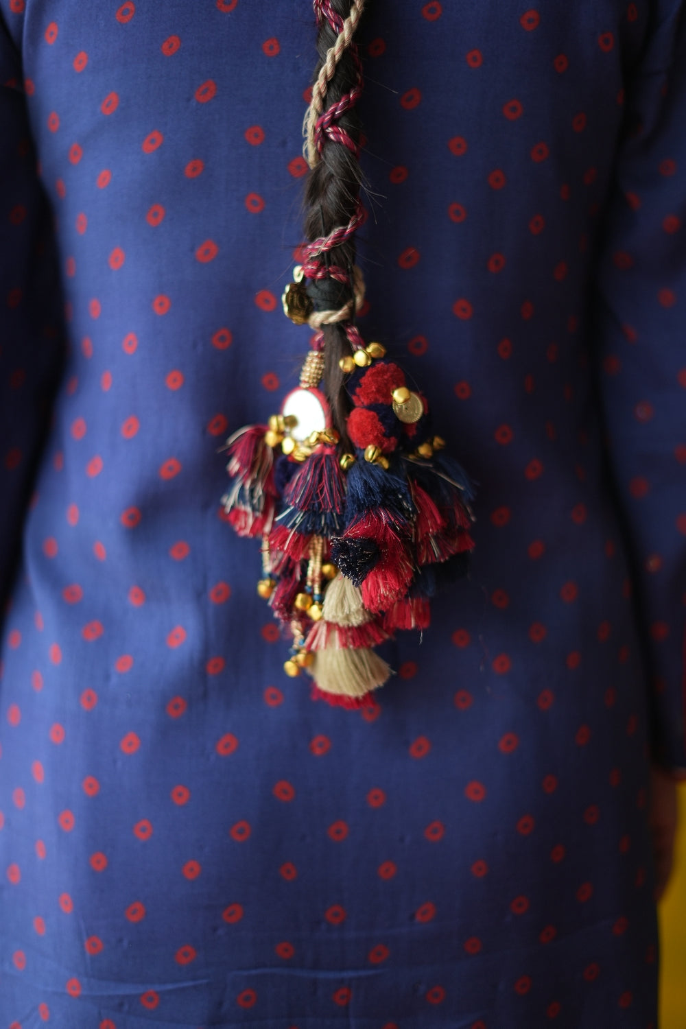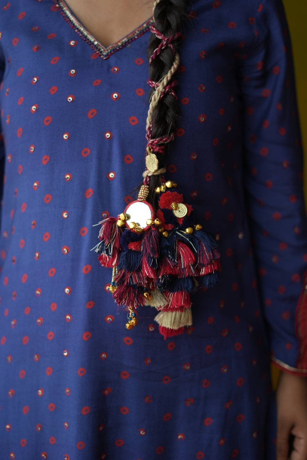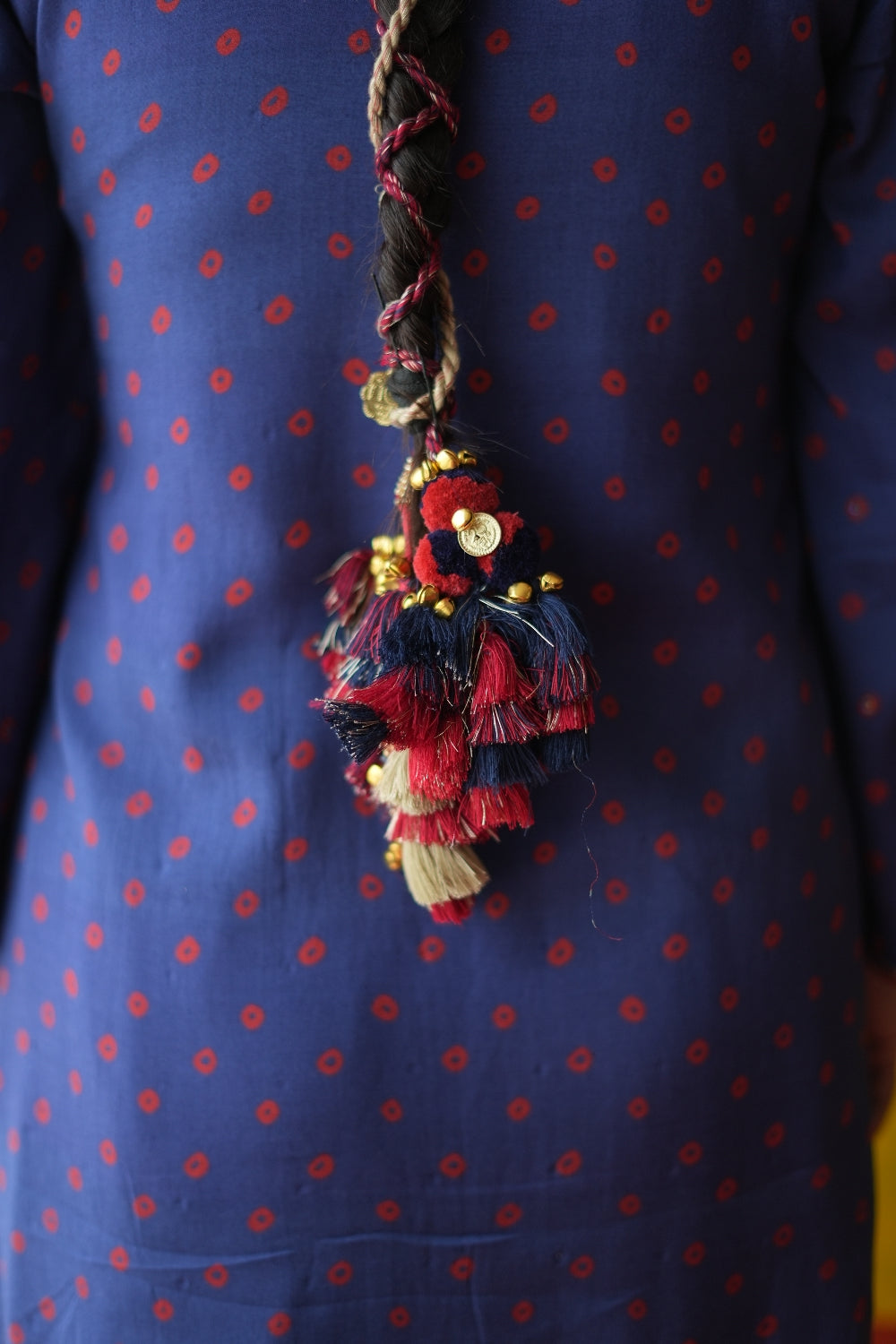 Our Multicolor Jhumri Paranda exudes a dramatic flair, featuring three doris crafted from golden threads. Each dori holds a tiered tassels in vibrant red, blue and beige shades. These tassels are adorned with mirrors, pompom and golden ghungroos as embellishments, adding a touch of traditional elegance to this striking paranda set, perfect for enhancing festive and cultural outfits.