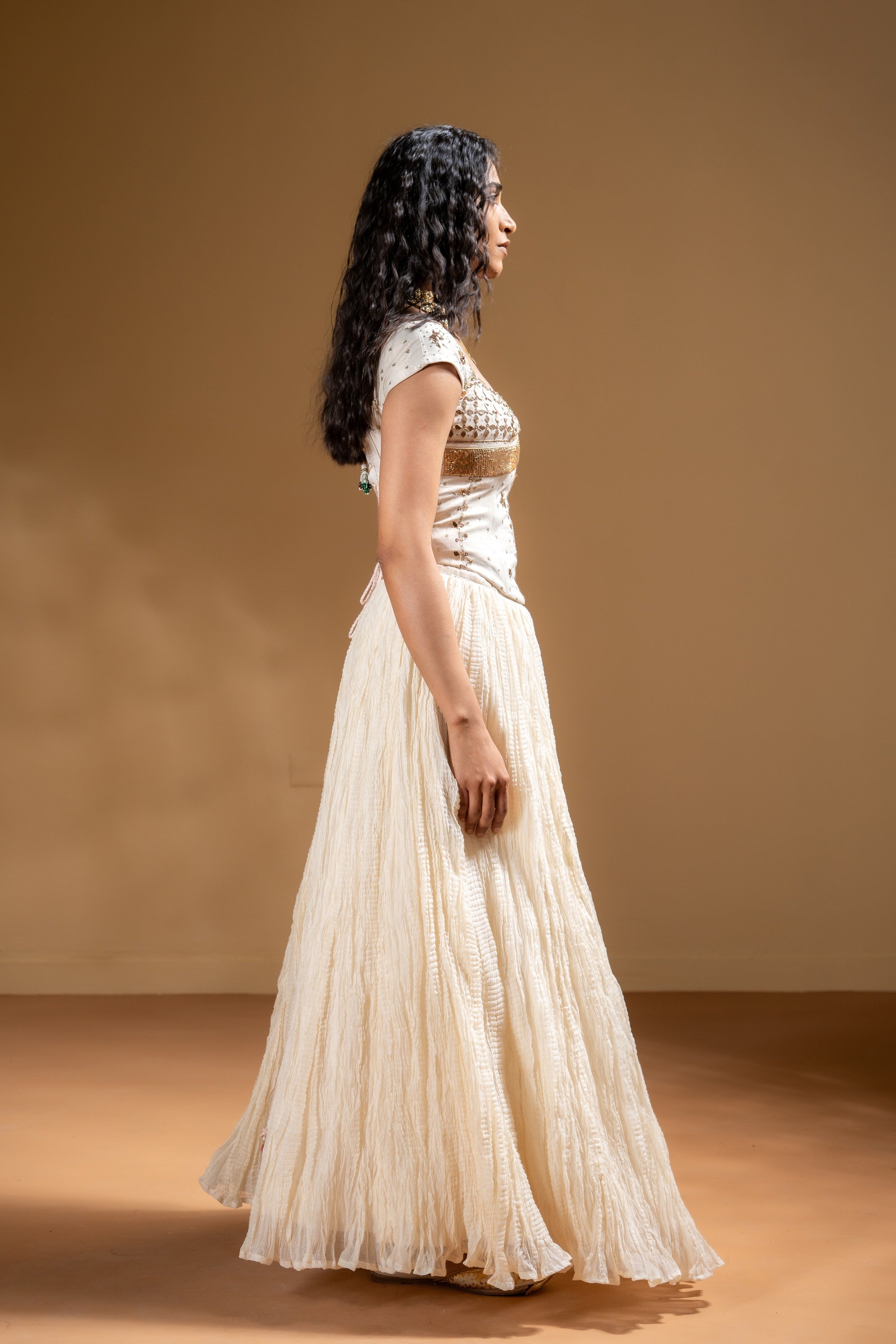 A two-piece set featuring a wrinkled white Chanderi skirt with pocket that adds texture and fluid movement. Paired with a Off-white corset top in muslin highlighted with full gota work, the ensemble balances structure and softness, offering a modern yet festive silhouette ideal for celebratory occasions.