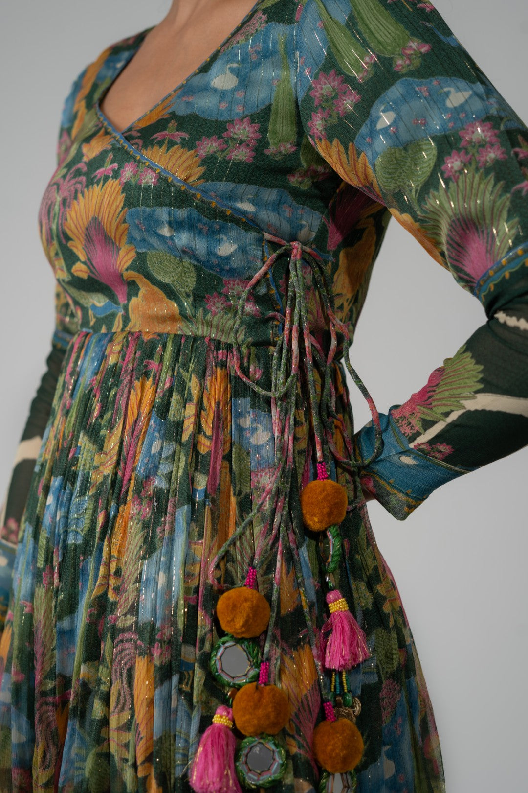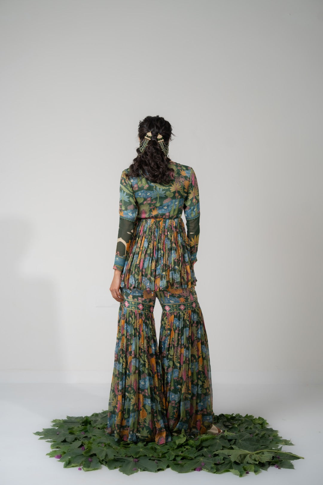 This ensemble features an angrakha-style choli in a vibrant green base, adorned with exquisite Mughal-inspired prints on lightweight Lurex chiffon. The top is detailed with dori tassel ties and full-panelled sleeves, adding a touch of elegance and grace. It is paired with matching printed Lurex chiffon gharara pants, creating a comfortable, lightweight, and festive-ready outfit perfect for celebrations and special occasions.